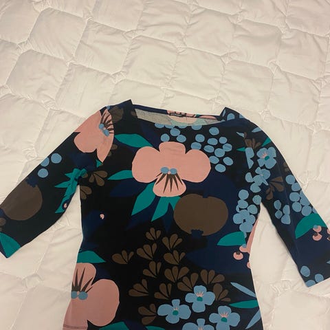 Marimekko, Jukka Rintala made in Finland ihana liehuvainen 100% silkki paituli. Koko M, mutta menee ihan XL kokoisellekin! Kaunis, epäsymmetrinen leikkaus, ihana kuviointi. Hieman pientä langanpurkaantumaa voi paikoittain olla, mutta todella siistikuntoinen. Ei ole päässyt itselläni tarpeeksi käyttöön, joten joutaa uuteen kotiin, jossa pääsisi käyttöön kaapissa lojumisen sijaan. Kissankarvoja voi mukana olla!
