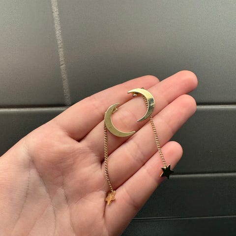 Metalliset roikkuvat korvakorut, joissa valkoisia yksityiskohtia.