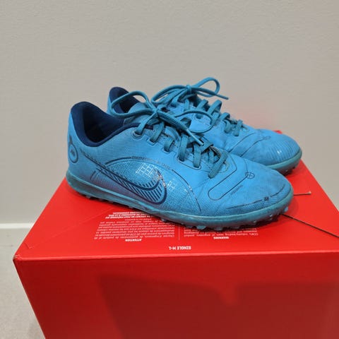 Nike Hypervenom Indoor jalkapallokengät, koko 35.5 (US 3.5Y, EU 35.5, UK 3), väriltään vihreät mustilla yksityiskohdilla. Sisäpohjallinen ja pohja on suunniteltu sisäpelikäyttöön. Materiaalina synteettinen kangas ja kumipohja. Kengät soveltuvat nuorille tai pienikokoisille pelaajille.