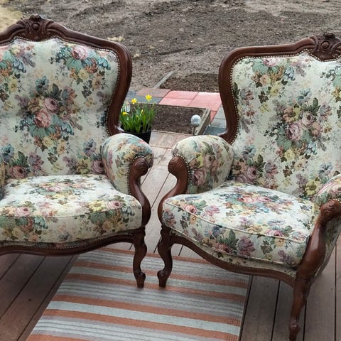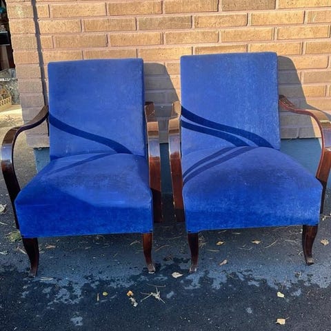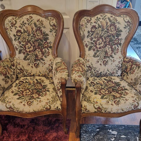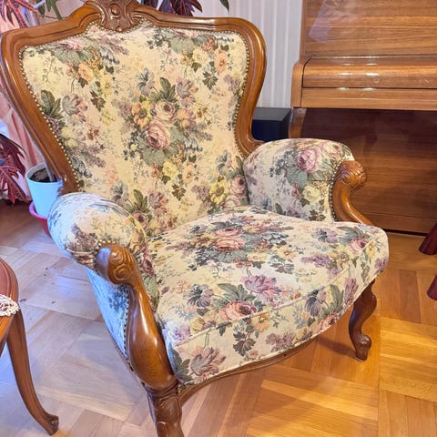Iän mukaista kulumaa, ehjät. Tuolit ovat vanhoja joten saattaa olla varastoinnista tms. tullutta tuoksua.
