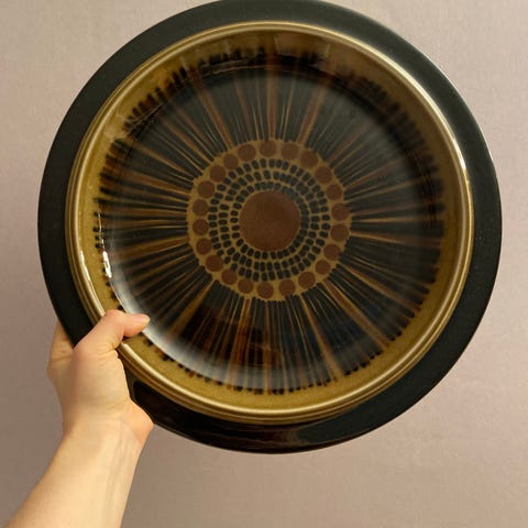 Arabia lautanen, jossa ruskea ja musta kuviointi. Lautanen on valmistettu keraamisesta materiaalista ja soveltuu käyttöön keittiössä erilaisissa ruokailutilanteissa.