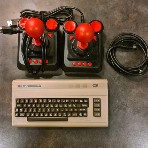 Uusi, käyttämättömäksi jäänyt Commodore 64 -pelikonsoli. Ostettu vuonna 2018.