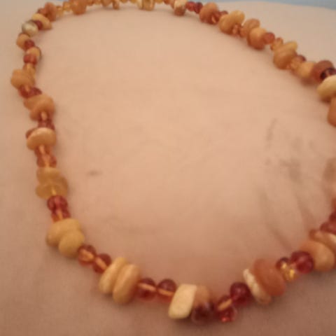 Makeanveden helmiä, sekä hematiitti helmiä, pienet kullanväriset välihelmet. Pituus 70 cm, paino 65 g