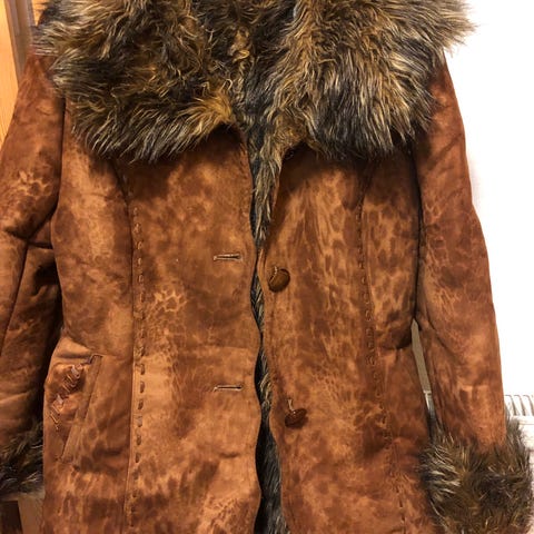 Takissa ei ole kulumia, tahroja eikä vieraita hajuja – ollut käytössä hyvin vähän ja on erittäin siistissä kunnossa.Koko M-L , pituus 120 cm , hihan pituus 62 cm , leveys kainaloiden välillä 57 cm .