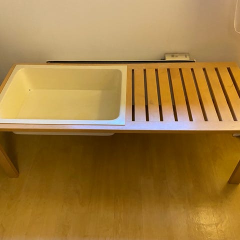 Hyväkuntoinen 60-luvun tiikki kukkapöytä altaalla.