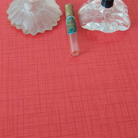 Antiikkinen parfyymi laatikko. Sinisiä koriste helmiä on irronnut, muuten hyväkuntoinen.
