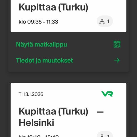 VR opiskelija junalippu Helsinki - Kupittaa (Turku) - Helsinki 13.1.2026