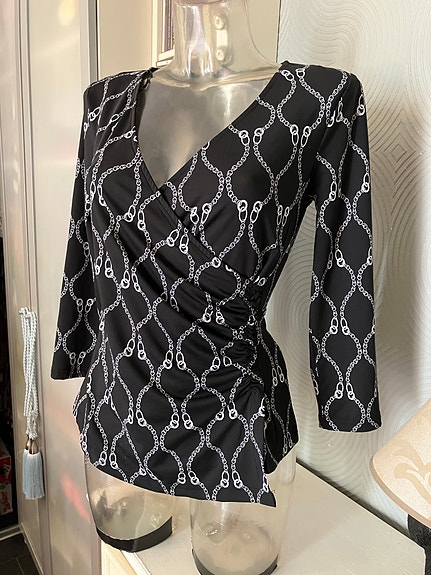 Myynnissä kuvan todella kaunis joustavaa viskoosia oleva mustavalkoinen kietaisutyylinen pusero kuvioin <3