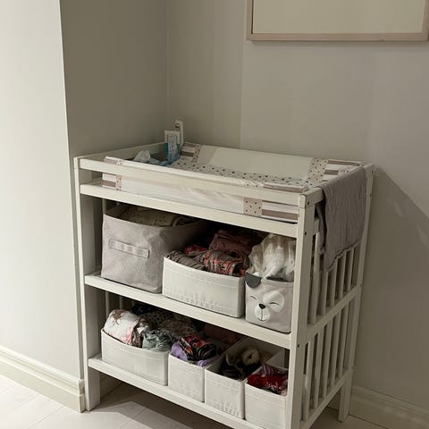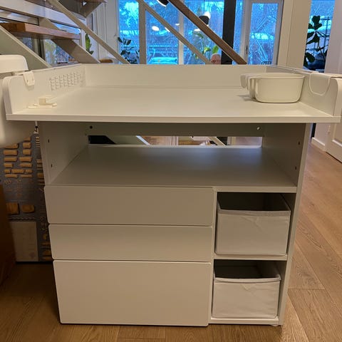 IKEA lastenhoitopöytä, valmistettu puusta ja maalattu valkoiseksi. Kolmikerroksinen rakenne tarjoaa tilaa hoitotarvikkeille ja vauvan vaatteille. Sopii lastenhoitoon ja vauvanhoitotarpeisiin. Väri valkoinen.
