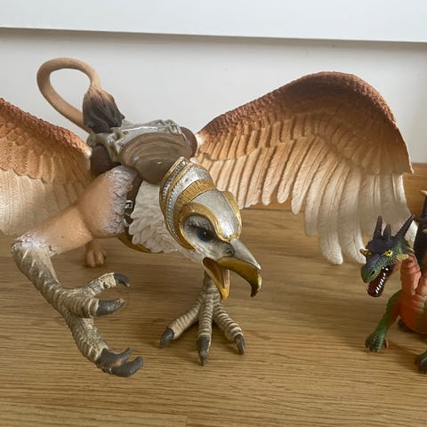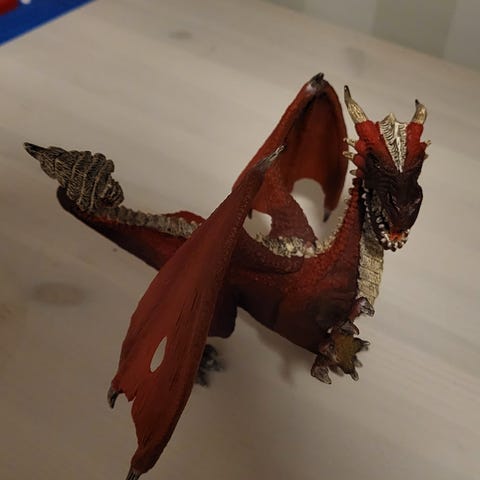 Lohikäärme lelu, jossa on oranssit siivet ja sininen runko. Valmistettu kestävästä materiaalista.
