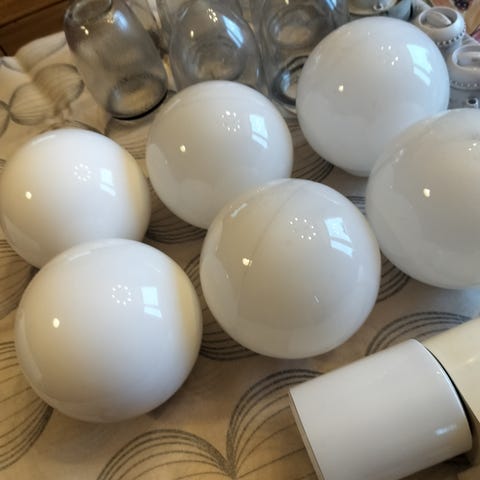 "Kellarilampun" kuuppia standarimittaisia, messinkinen hana ja muutama pakeliittinen sähkötarvike. Kaikki 50-luvulta.