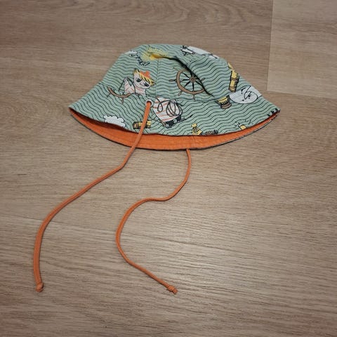 Hyväkuntoinen Swimpy uv-uimalakki, jossa on muumi -aiheinen kuva. Lakki on tarkoitettu n. 1 - 2 -vuotiaalle taaperolle suojaamaan päätä liialta auringonpaisteelta vaikkapa etelän lomamatkalla.