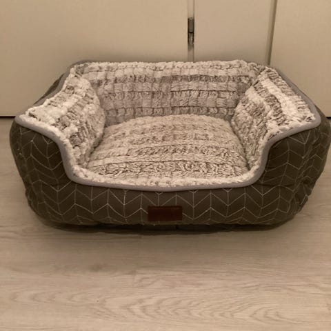 Harmaa hyväkuntoinen peti. Koira ei tykännytkään maata. Koko n. 60x50cm. Pääliset voi pestä koneessa.
