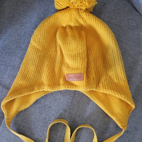 Myydään kuvan vaaleanlila Gugguun puuvillapipo, koko XXL ja Little Mayan lipallinen musta pipo, lilalla rusetilla, koko 52.
