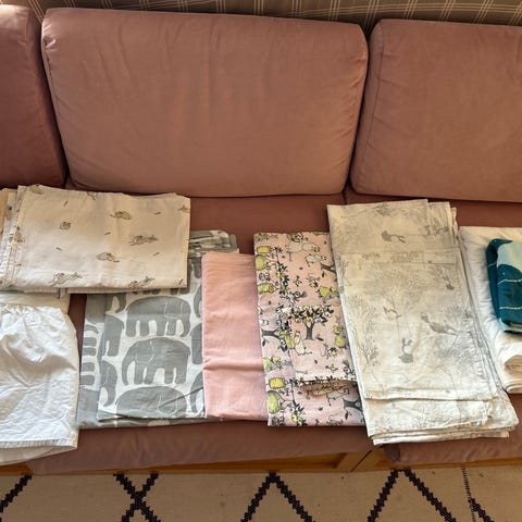 7 Pussilakanaa, 6 Tyynyliinaa, 6 muotoonommeltua lakanaa ja 1 normaali lakana. Kaikki ehjiä.