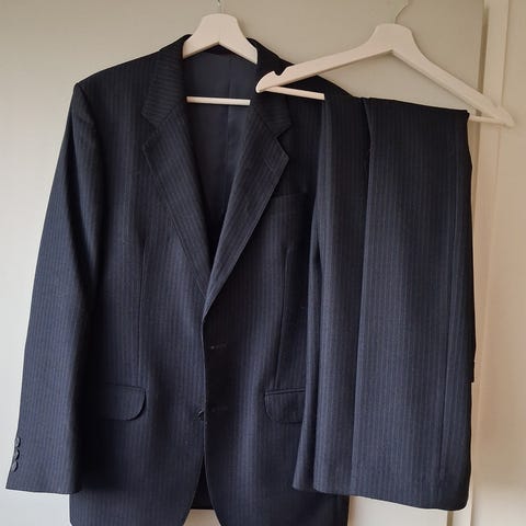 Myydään Master musta vintage-puku. Puku on ommeltu paksusta villakankaasta. Takissa kaksi nappia edessä, ei takahalkiota.
