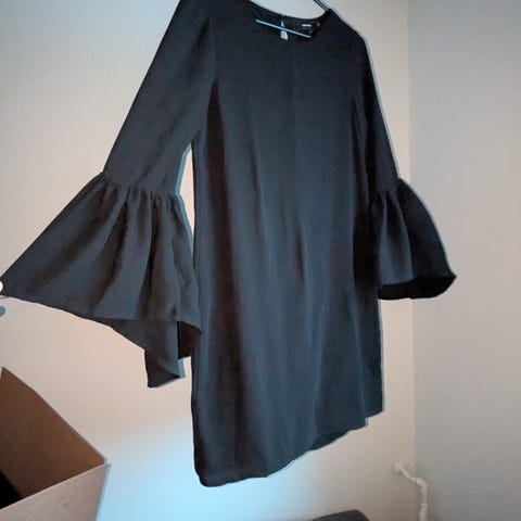 Musta Vero Modan mekko, pitkä takaa lyhyempi edestä. Kokoa XS. Takana vetoketju ja nauhat jotka menee niskan taakse. Nouto Tikkurilasta.