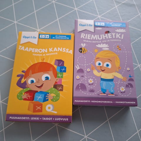 Oppi&ilo Taaperon kanssa puuhakortit. Kortteja, joissa puuhavinkkejä 1-3 vuotiaalle. Kaikki kortit tallella. Kortit ehjiä eikä taiteltuja, eikä piirretty jälkiä. Jossain voi reunasta nähdä että selattu. Pakkaus ehjä.