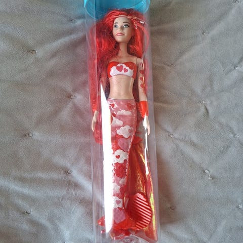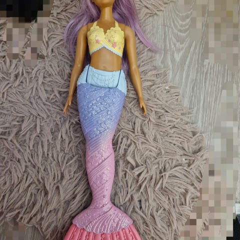 Barbie mermaid. Nukella on kirkkaan pinkit hiukset ja oranssi merenneidonpyrstö.