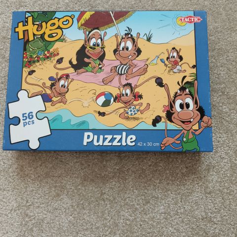 Hugo Lattialaatta-palapeli, koko 60x 40cm. Palapelin kuvituksena on Hugo-hahmoja, ja palapelin palat ovat suurikokoisia, sopivia lapsille.