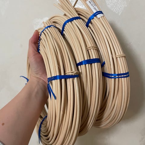 Myytävänä vaaleaa puolipyöreää rottinkia yksi kiekko paino kuivana 450g ja hinta 10€.