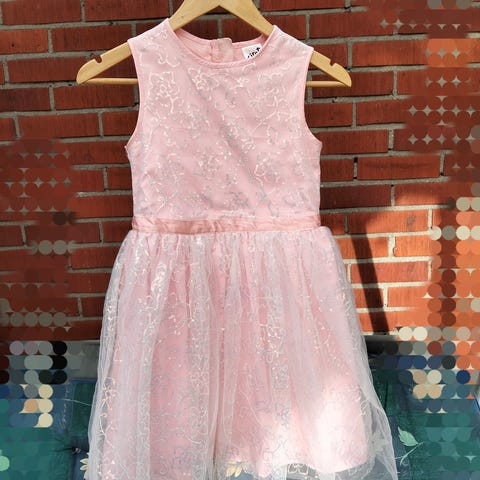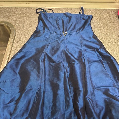 Ihana valkoinen mekko, jossa helmassa kaksi sinisistä paljeteista ommeltua raitaa. Mekkoon kuuluu valkoinen vyö, mutta sininen satiinivyö sopisi loistavasti ja tekisi mekosta vielä juhlavamman. Malliksi kuvassa kaksi satiininauhaa, joka sattui löytymään kaapista (jostain lahjapaketista jäänyt jemmaan, saa kaupan päälle halutessaan, nauhasta viimeinen kuva). Silitettynä mekko toki on vielä kauniimpi, nyt ei ole silitetty.