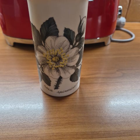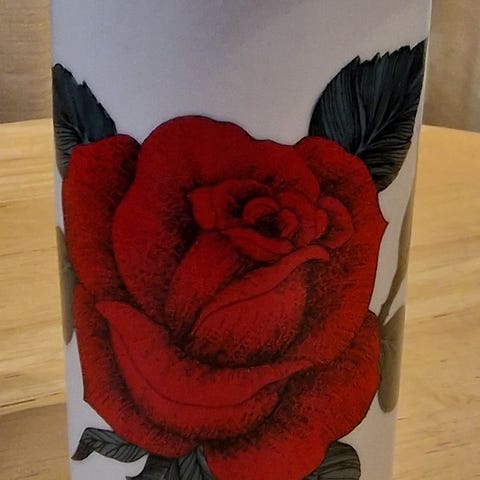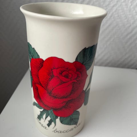 Arabian Rosa Baccara-maljakko, design Esteri Tomula, kork 14 cm, pohjan halk 6 cm ja yläreunan halk 7,5 cm. Toridiili tai Itäkeskus/Kalastama, Hki.
