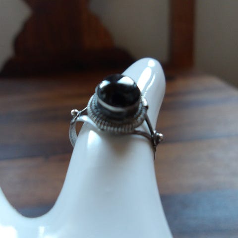 Egyptiläinen kuoriaissormus meripihkasta, sormus hopeaa. Koko 17,5. Kuoriaisen pituus 2,5 cm ja lev 2 cm. Toridiili tai nouto Itäkeskus/Kalasatama, Hki.