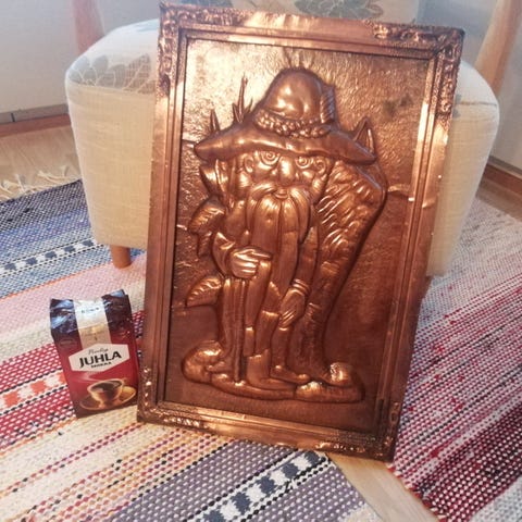 Uudenveroinen kuparinen taulu. Käsintehty / made in Finland. Maalaismaisema , heinälato , hevonen , kyntöaura ja lapset sekä pistoaita . Koko 195mm x 283mm. Haku Karsikko tai postitus.
