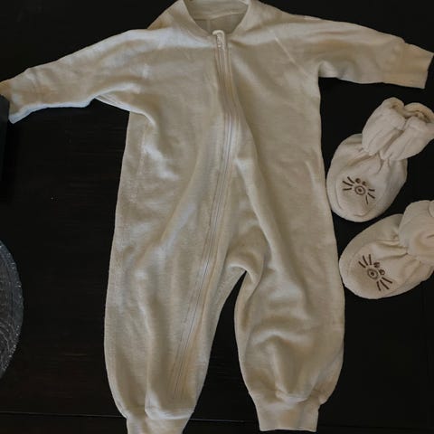 Luonnonvalkoinen Janus haalari ohutta villasekoitetta. Koko 68/74. Nukkaa pinnassa ja yksi tahra edessä (kts. kuva). Silti vielä ihan siistikuntoinen ja pehmeä. Pesty hajusteettomasti ohjeen mukaan. Lemmikitön, savuton ja sisäilmaongelmaton talous.