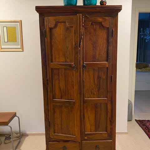 Rustiikkinen, tyylikäs. Ollut keittiössä astiakaappina. Ollut lastenhuoneessa vaatekaappina..yms. Kaksi irroitettavaa hyllyä sisällä sekä henkarirekki mahdollisuus kun ottaa ylähyllyn pois. Rekki kuuluu kaappiin mukaan. Kulumaa jossain kohtia mutta kuuluu tuohon tyyliin.