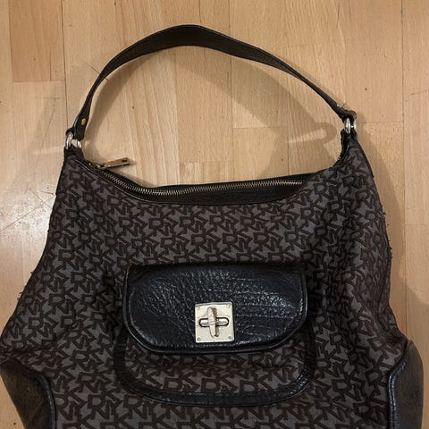 DKNY nahkainen käsilaukku naisille ruskeassa värissä. Laukussa on tikattu pinta ja kultaiset metalliyksityiskohdat. Laukku on varustettu säädettävällä olkahihnalla, jossa ketjuelementtejä. Ulkopuolella yksi vetoketjutasku.