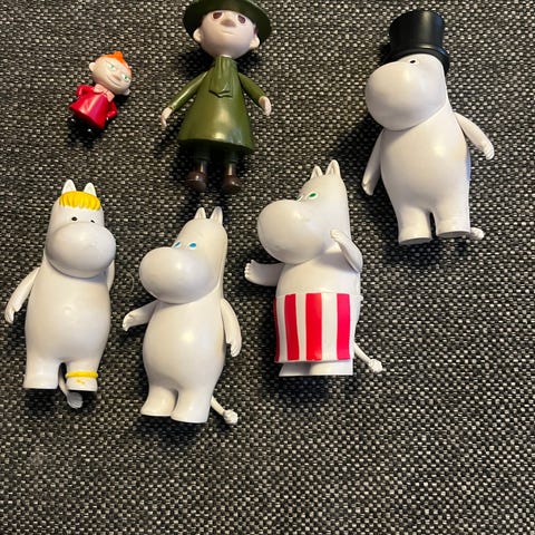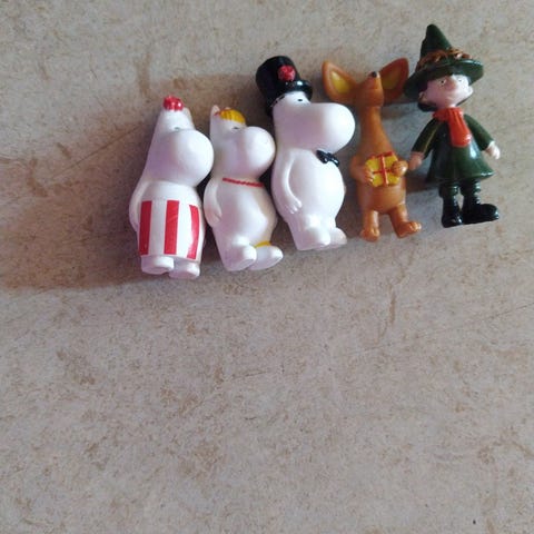 Muumit Muumipeikko ja Niiskuneiti koristehahmot valkoisena, mukana pieni koristekakku. Hahmot ovat muovia ja niissä on yksityiskohtia kuten Niiskuneidillä musta silinterihattu. Koristeet soveltuvat sisustukseen tai keräilyyn.