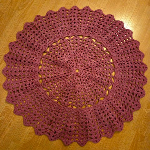 Halkaisija noin 100cm. Pesty, mutta ollut varastossa säilössä noin viimeisen vuoden joten voi kaivata kevyttä pesua. Pohja ehjä eikä lankoja irtoile.