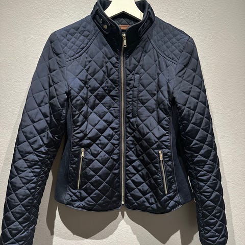Zara tikkitakki/ratsastustakki tyyppinen. Väri tummansininen, lähes musta. Koko XS. Irrotettava huppu. Veroketju, napit, tuplataskut, takana vyötäröllä kiristysmahdollisuus.