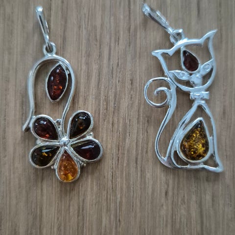 En ole varma ovatko aitoa meripihkaa. Isompi riipus n 3,5cm. Vähäistä kulumaa voi olla.