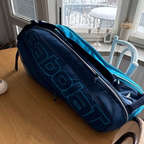Tennislaukku johon mahtuu useampi maila, kengät ja muita tarvikkeita. Kunto ei enään uusin mutta ajaa hyvin asiansa vielä