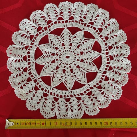 Luonnonvalkea, käsin virkattu pitsiliina, halkaisija 25 cm. Puuvillaa. Ehjä. Postitus tai nouto.