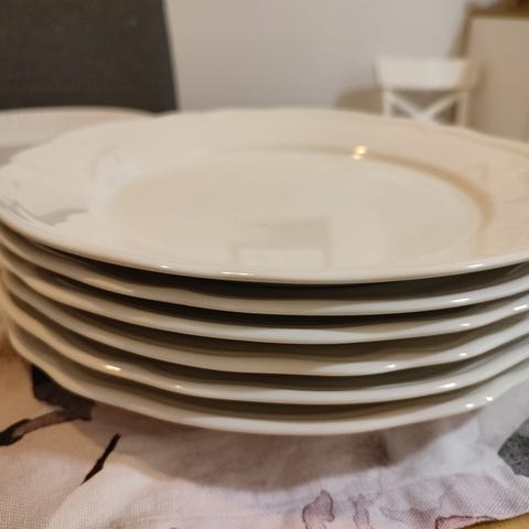 Kymmenen kappaletta vihertävän beigejä astioita, neljä matalaa ruokalautasta, neljä syvää lautasta ja kaksi kulhoa. Pari pientä riksua.