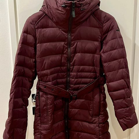 Ei muuta moitittavaa kunnossa kuin pienen pieni pintanaarmu takin etumuksessa (kuva). Myös vyö puuttuu, mutta ei vaikuta takin istuvuuteen tai yleisilmeeseen. Vuoressa hieman värjäymää mutta ei huomaa ulospäin:)