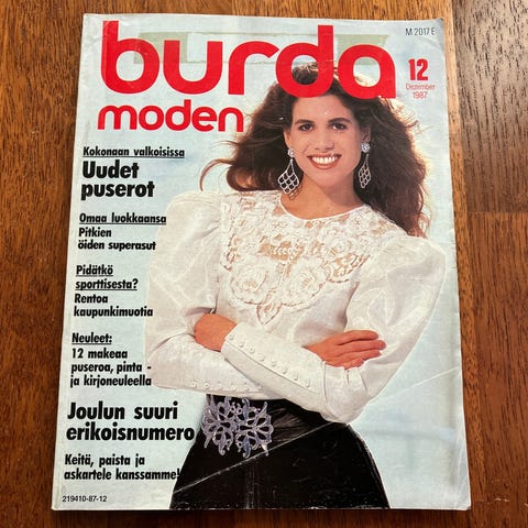 Hakusanoja: Burda 10/1987 10/87 1987 loka käsityölehti käsityölehdet käsityölehtiä käsityö kaavalehti kaavat kaava lehti suuri sk ottobre päähine hattu kellohame nahkatakki yöpaita yöpuku yöasu yöasut yömekko pyjamamekko pyjama pyjamapaita pyjamahousut pyjamashortsit pöksyt pitsipeitto reikäpitsi reikäommel mies-paita mies-housut mies-pusakka 80-l 80-luku 1980 1980-l 1980-luku kasari retro burda-lehti