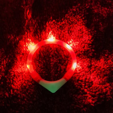 Ladattava punainen Leuchtien valopanta, koko 40 cm. Toimii moitteettomasti, jäi vaan pieneksi. Hyvä akun kesto. Mukana usb-laturi, ei seinäpistoketta (ei kuulu pakkaukseen).