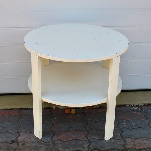 Kaunis vanha pyöreä pöytä. Maali on kauniisti patinoitunut. Mukaan tulee pitsiliina. Hinta 25€.