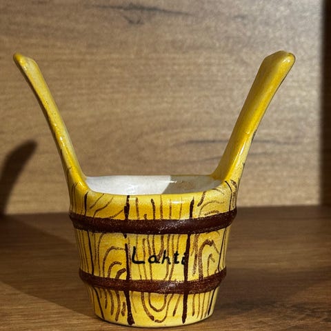 Kupittaan Saven pieni kiulu/haarikka. Korkeus kiulun reunaan n. 5 cm ja kahvoineen n. 10 cm.