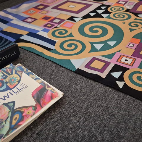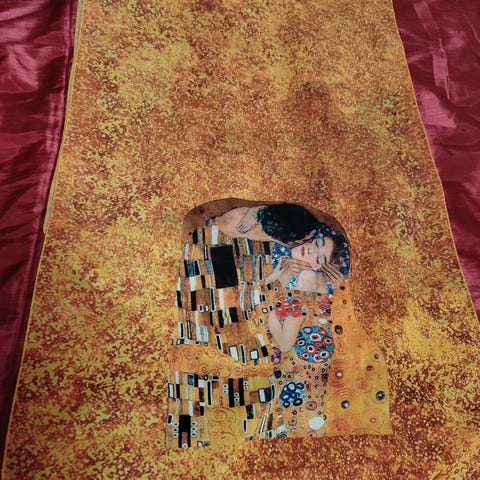 Käyttämätön huovi, jossa vintage jäljennös Gustav Klimtin suudelma maalauksesta. Huivi on kuvassa kaksinkerroin.