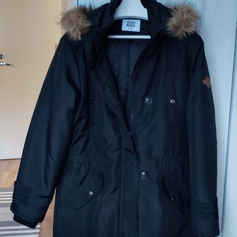 Uusi pehmeä karvavuorinen talvitakki. 50 lapun mukaan koko, mutta pienempi 46 vastaa. Kainalo kainalo mitta 65 cm. Hupun karva irrotettavissa. Väriä salama haalistaa.