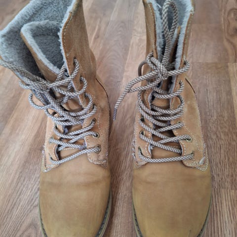 Tukeva, pitävä, paksu pohja, turkisvuori, käännettävä varsi toppakangasta. Hyvä kunto muuten, mutta etuläpän toppakankaan reunassa kulumajälkiä, kts.kuvat.