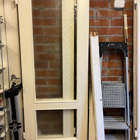 Puuovi lasi-ikkunoilla. Entinen ulko-ovi, viime vuosikymmenet ollut sisäovena. Maalattu. Lukko ja avain siihen. Eläimetön talous. 90 x 200,5 cm. Vain ovi lukkoineen, karmit eivät tule mukaan.