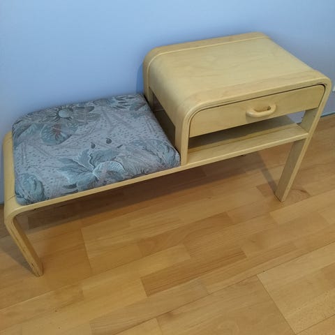 Eteisen penkki neljällä laatikolla ja pehmusteella.