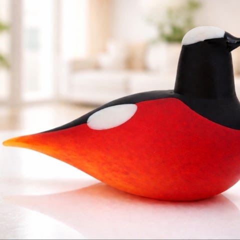 Oiva Toikan vuoden 1988 SOK:n yrityslintu Karjalalintu. Pohjassa Oiva Toikan signeeraus ja kyljessä Nuutajärven lasin tarra. Harvinainen löytö. Särö linnun niskassa, mikä näkyy toisessa kuvassa.